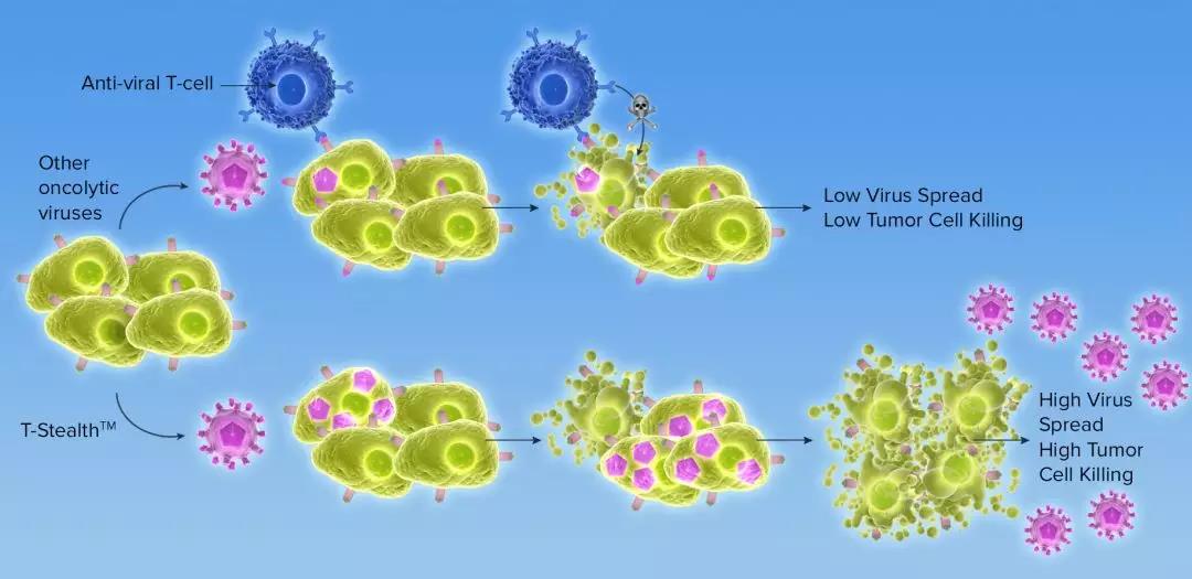 令人可喜的是,有些公司宣布,他们发明了一些专利技术,攻克了抗癌病毒疗法的壁垒,能够让抗癌病毒躲避T细胞的追杀,这样能够让抗癌病毒在体内复制繁殖更多,传播更远,杀死更多肿瘤细胞。(具体原理,见下面的示意图)