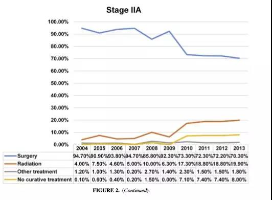 总体手术率为79.8%。所有Ia期到IIa期肺癌病人手术率从2004年的83.9%到2013年下降到75.1%,具有显著差异 (p<0.0001)。其中: